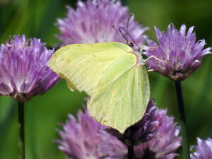 Abb. 1: Große Fläche des Gründaches auf der mittleren Ebene des Müritzeums Abb. 2: Ein Zitronenfalter saugt an einerSchnittlauchblüte auf dem Dach Abb. 3: Automatische Lichtfalle auf der unteren Ebene des begrünten Daches. Das Gestell um die Lichtfalle dient ihrer Sicherung bei stärkerem Wind. |